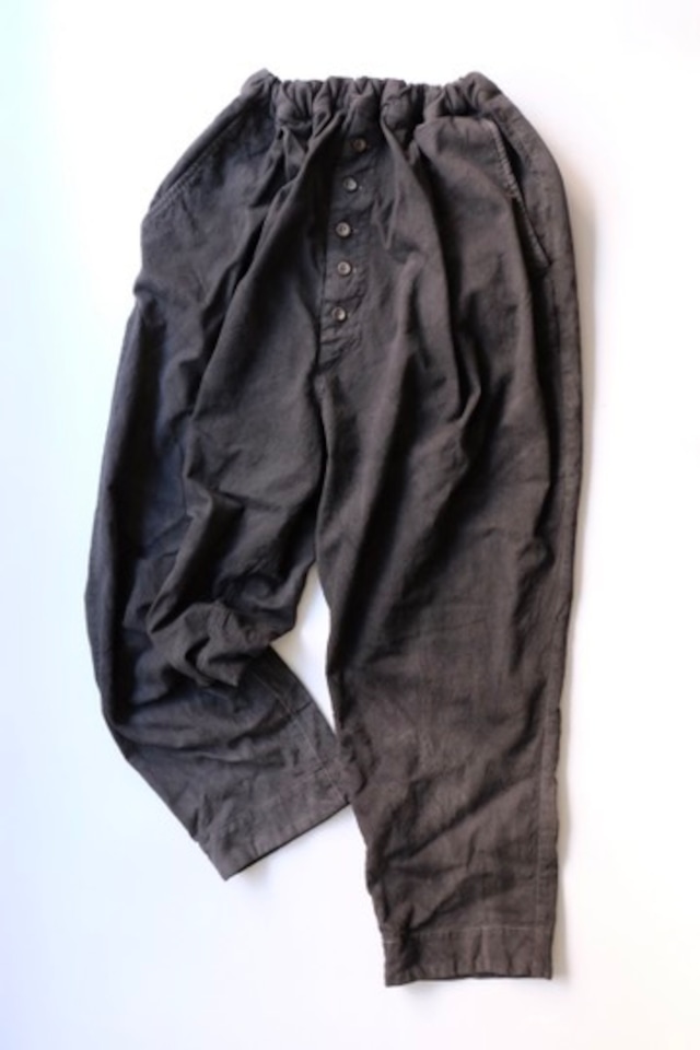 HOMELESS TAILOR 2026 New years Item Calm Line Trousers 墨染 ※色止めはしておりますが、1.2回は単独でのお洗濯を推奨しております。 75%cotton, 24%wool, 1%polyurethane Size F ウエスト〜114cm, 股上42cm, 股下63cm Made in Japan