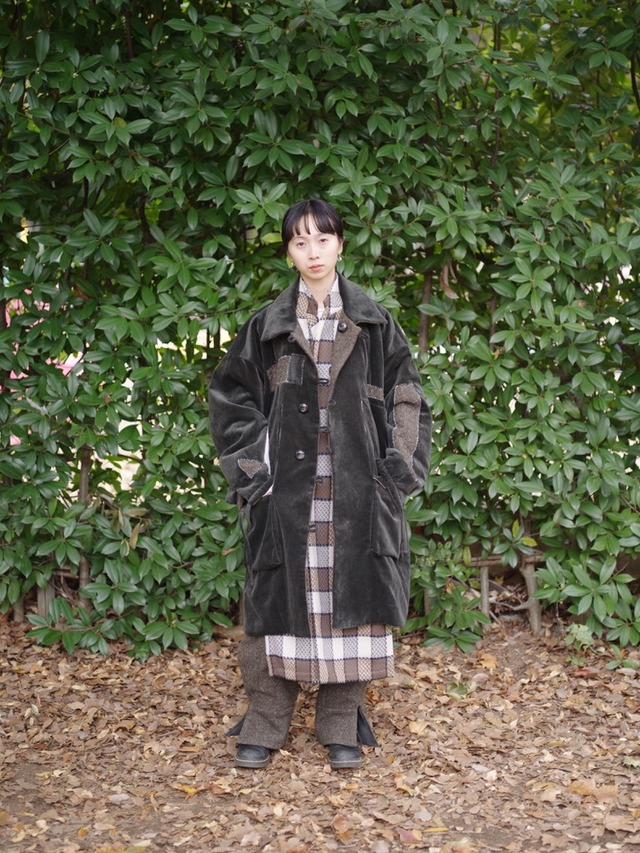 OIRA 25AW 004/I(私)fantasize(空想する) reversible coat exclusive for Skool Size One 着丈100cm, 身幅71cm, 肩幅63cm, 袖丈57cm Green ST × Brown 50%polyester, 50%cotton / 100%wool Black BORO × Brown 80%cotton, 20%linen, / 100%wool model 162cm
